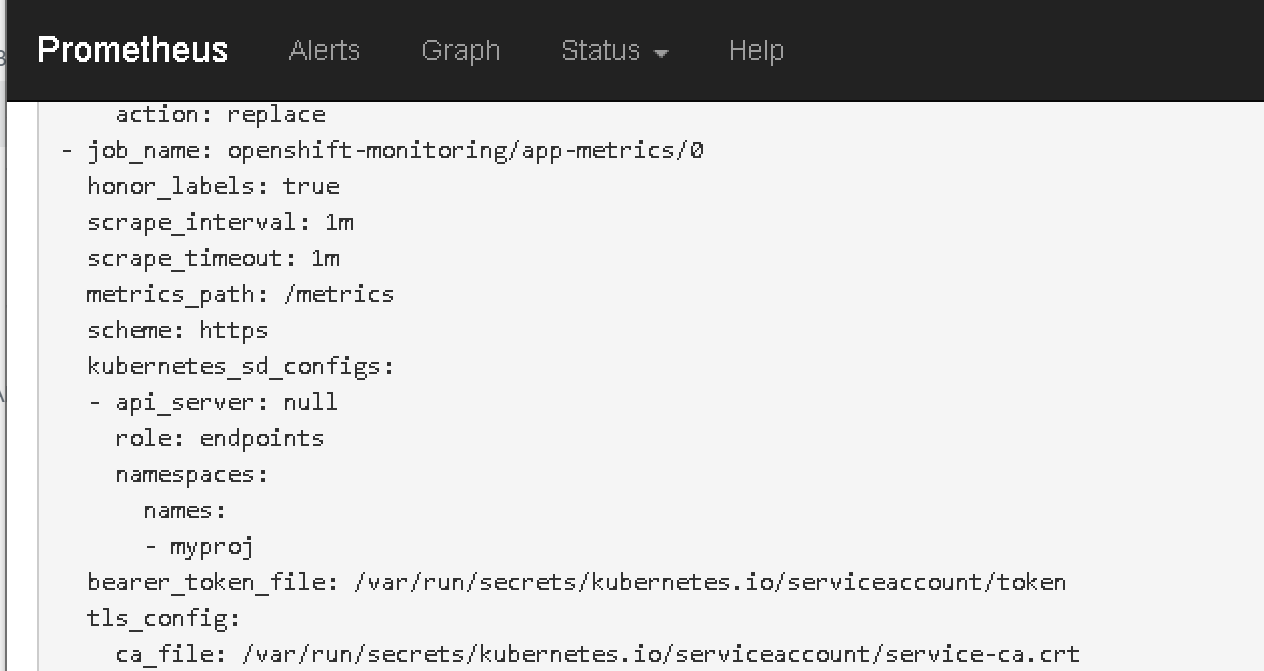 举个例子, 我的应用 pod 跑在 myproj project/namespace 下. 虽然 kube-state-metrics 会收集 myproj 名字空间下资源 (deployment/statefulset/pod) 的状态信息, 但是预定义的 alert rules 只选取 openshift-.\*|kube-.\*|default|logging 这些 namespace 的 metrics 来进行评估. 导致的结果是: 虽然收集了应用 namespace 下的资源状态信息, 却无法实现告警.