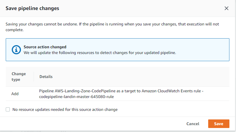 保存退出. 此时会提示将自动添加 AWS Cloudwatch Events rule. 这里我们需要 Events rule 来跟踪 CodeCommit 的变化进而触发 CodePipeline, 因此保持 "No resource updates needed for this source action change" 为默认的不勾选状态, 让 AWS 自动创建 Cloudwatch Events rule.